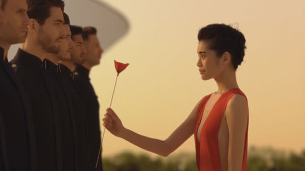 En este spot de celebración también están muy presentes el cemento y los hombres, esta vez sin armas. También podemos ver a la mujer vestida de rojo, rojo amapola y con una de esas flores en la mano seduciéndolos.